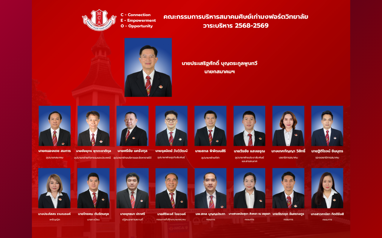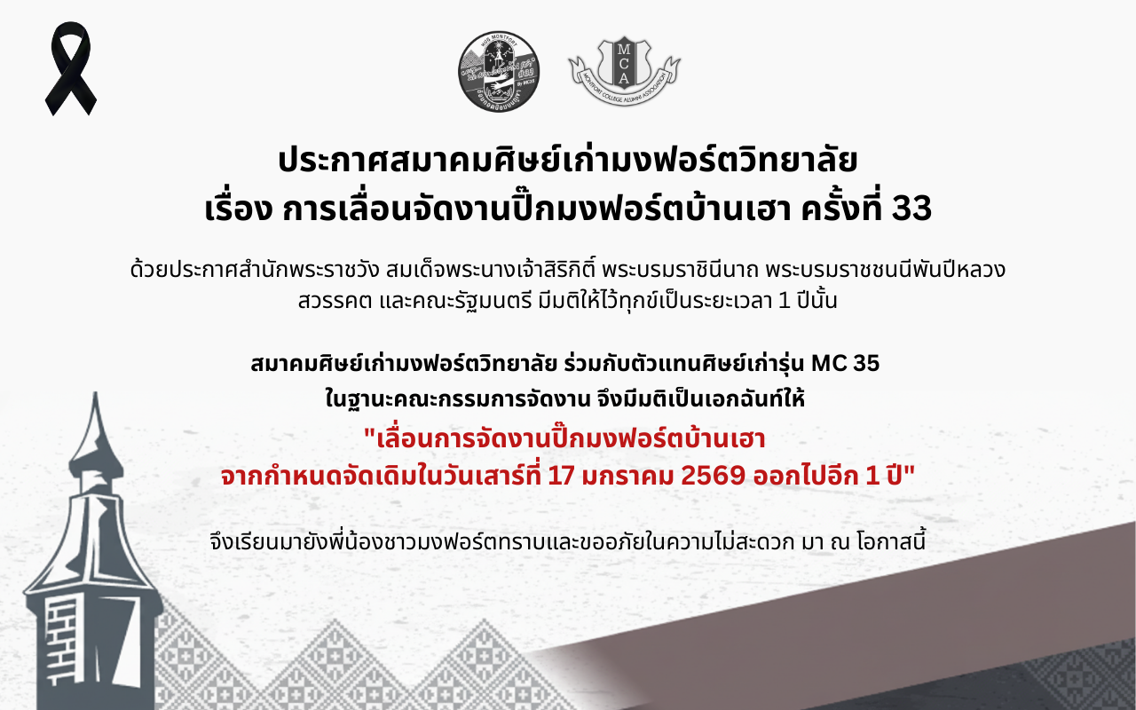 Website HNY MCA 2026Website ประกาศยกเลิกปิ๊กมง ครั้งที่ 33Element For MCA Web BannerWebsite HNY MCA 20265 ภาพข่าวกิจกรรม โครงการ และผลงาน ดูทั้งหมด นิทรรศการ “อัญมณีล้านนา” มงฟอร์ต 90 ปี อัญมณีล้านนา January 27, 2022 โครงการ MCA ลดหมอกควันไฟป่า ร่วมกับพี่น้องปกาเกอะญอ บ้านดอยช้างป่าแป๋ จ.ลำพูน December 4, 2021 ประกาศ/ข่าวสารประชาสัมพันธ์ ดูทั้งหมด ประกาศสมาคมศิษย์เก่ามงฟอร์ตวิทยาลัย เรื่อง การเลื่อนจัดงานปิ๊กมงฟอร์ตบ้านเฮา ครั้งที่ 33 January 3, 2026 ประกาศสมาคมศิษย์เก่ามงฟอร์ตวิทยาลัย เรื่อง คัดเลือกผู้เสนอราคาจัดทำชุดกีฬา ประจำปี 2568-2569 October 11, 2025 กำหนดการ “ปิ๊กมงฟอร์ตบ้านเฮา 90 ปี๋” January 20, 2023 การสั่งจอง เสื้องานปิ๊กมงฟอร์ตบ้านเฮา 90 ปี๋ December 4, 2022 โรงเรียนเก่า | มงฟอร์ตวิทยาลัย วิถีความดี อัญมณีแห่งล้านนา October 25, 2022 ขอเชิญสมาชิกสามัญสมาคมศิษย์เก่ามงฟอร์ตวิทยาลัยร่วมประชุมใหญ่สามัญประจำปี พ.ศ.2565 March 8, 2022 ติดตามข่าวสารจากทางเราได้ที่ ติดตามข่าวสารโรงเรียนมงฟอร์ตวิทยาลัย